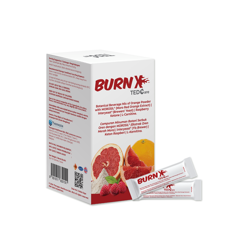 BurnX, crafted by TEDCare is a botanical beverage mix fruit containing Morosil More Red Orange Extract, Interyeast Brewers’ Yeast, Raspberry Ketone and L-Carnitine