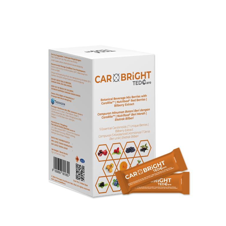CaroBright, crafted by TEDCare infused with 7 Unique berries combination and 5 essential carotenoid Blend from CaroRite. Further enhanced with bilberry extract and Nutrifood Red berries from Netherland for your daily well-being.