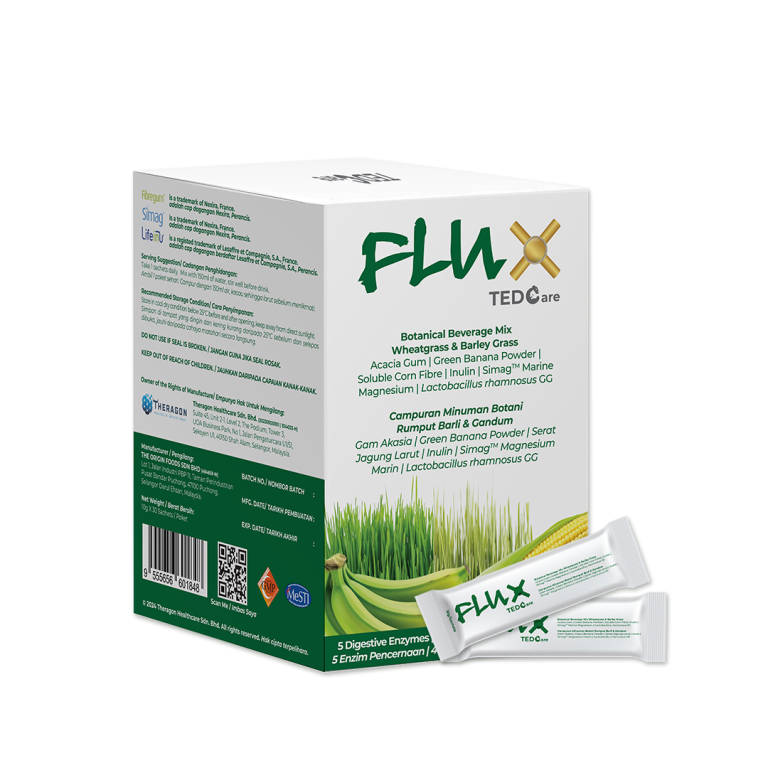 FluX by TEDCARE presents a convenient soluble fibre drinks. Packed with potent soluble fibres like Acacia Fibre Gum, Dole Green Banana Fibre and Corn Fibre, along with the synergistic addition of Simag Marine Magnesium that redefine your silhouette. Fushion of Quad Fibre Blend, 5 Digestive Enzymes in Flux it forms the ultimate solubles fibre blend.